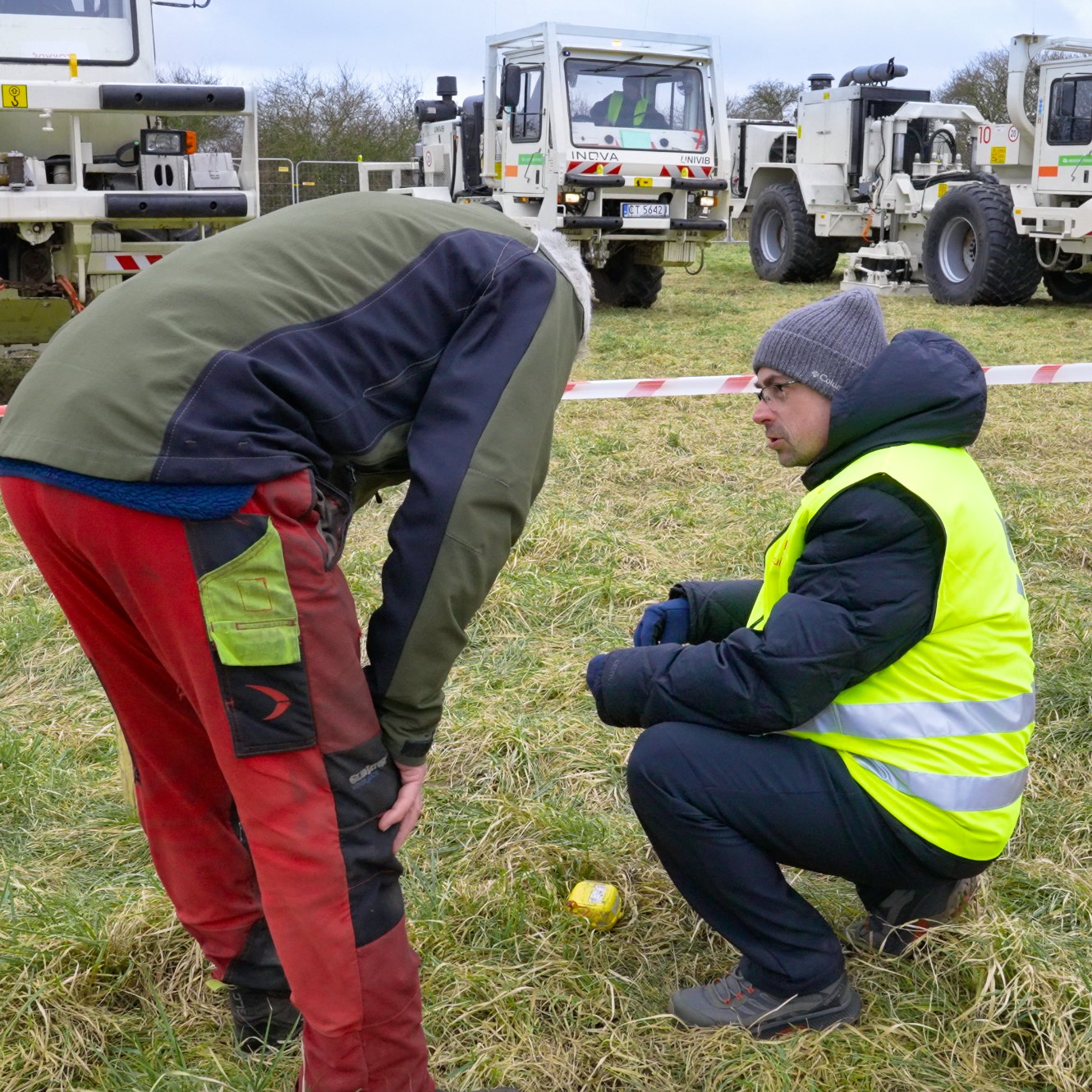 Det sker, når de første køretøjer bevæger sig ud i undersøgelsesområdet, og med vibrationsudstyr genererer lydbølger ned i undergrunden. Lydbølgerne reflekteres tilbage fra de forskellige lag i undergrunden og opfanges af små gule geofoner på jordoverfladen. Dermed kan der dannes et præcist kort af geologien i undergrunden.
